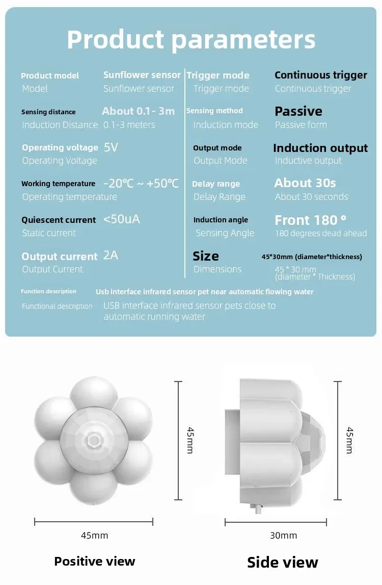 【Advantages】The pet water fountain sensor can be used in all water fountains with USB power supply, pets walking 3 metres in front of the sensor can reduce the noise of the water fountain, prolong the service life of the water fountain, and stimulate the pet’s interest in drinking water.