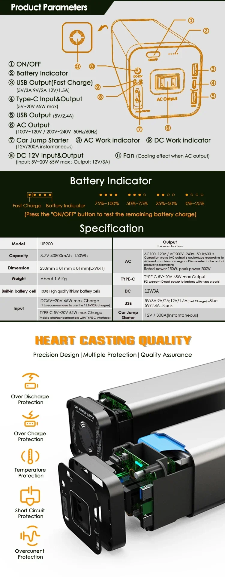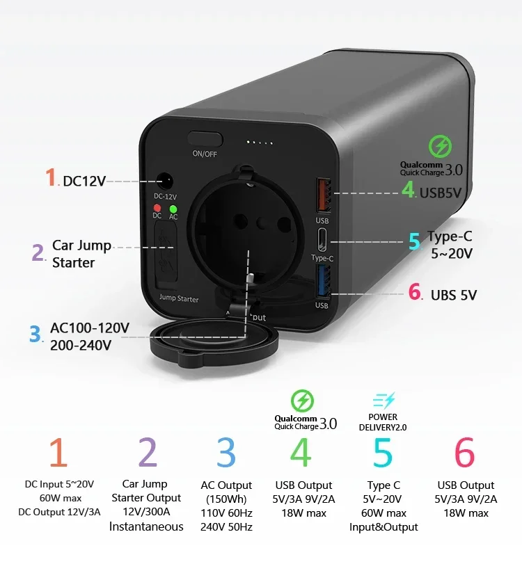 * Internal batteries are high quality rechargable Li-polymer batteries, safe, portable and green. * There are 4 different colors(black,red,gray,blue) for your selection * With AC/DC output and 12v/110v/220v / 5v output, it can be used as outdoor emergency power supply , which can satisfy power requirements of most mobile electronic products. * With Type-C 5V-20V output which can charge for laptop * With car jump starter function which can start for 12V petrol car |